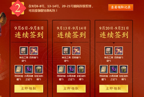 玩家在9月6-8号、13-14号、20-21号期间连续签到,可直接领取特惠礼包!包括15个神龙工商袋、百炼锤和寻回的秘籍等等。