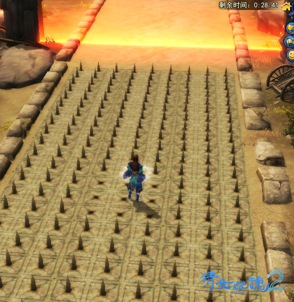 从传送入口开始,玩家趁钉板下降之际,往前尽量走多的步数。每段关卡前面都有1道光屏,越过光屏即是钉板。切记不可冲太猛,直接惨死钉板之上。