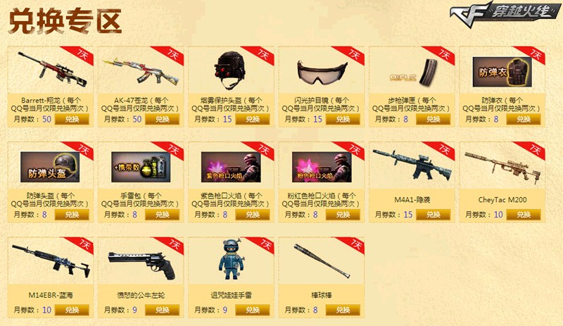 在指定兑换的列表中,有外观与威力并存的巴雷特-翔龙、AK47-苍龙,也有器棒球棒、1步枪M41EBR-蓝海等特色道具,此外还有诸如烟雾头、闪光护目镜、防弹道具、枪口火焰等各种辅助道具任由玩家兑换。而在幸运抽奖中,花费10兑月券后,玩家既可能抽到黄金沙漠之鹰、巴雷特-翔龙等价值数十月券的珍惜武器,也可能到手的是乌兹双枪-霓虹、火鸡背包这类趣味道具,收获全靠人品。