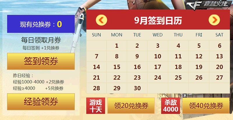 奖励如此丰厚,那么月券究竟如何获得呢?9月CFer军火基地的月券获取方式与往期变化不大,依旧是通过每日签到、每日经验任务、累计游戏10天、累计杀敌4000这四种方式获取。虽然每种方式获取的月券数各不相同,但本质上都是要求玩家关注游戏、畅玩游戏,因此不会与玩家的日常娱乐相冲突,使得每位CFer都可轻松获取月券,从军火库中获得充分补给。