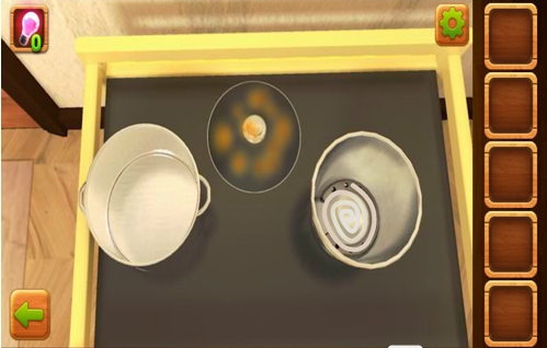 3、使用手头将门旁边的桌子上的锅盖拿起来,里面有个东西,用夹子将那个铁环拿起来。