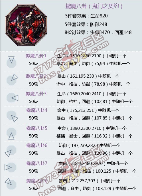 百刀八卦(暂译)-分裂的迷宫掉落(韩服地狱岛第二次更新前的物品)百刀八卦因为只有3件套的效果加成所以只能与其他八卦配合使用,全套属性加成确实不好,但其中一部分高暴击高命中的部件与其他八卦配合使用效果非常理想!
