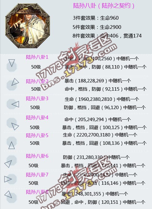 陆孙八卦-分别在武神塔12层(1-2号),13层(3-4号),14层(5-6号),15层(7-8号)掉落。和蠍魔八卦一样生命属性加成较多,也推荐与其他八卦配合使用。
