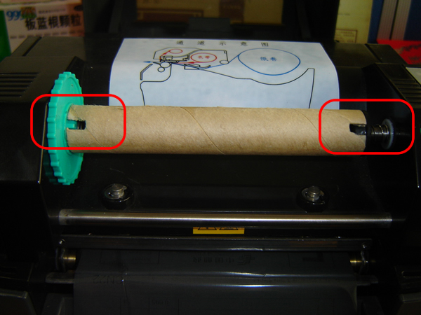 3、安装色带的时候,需要注意将色带芯轴豁口和色带挡板的凸台相对应、吻合(可参见以下安装好的色带回收轴示意图)。