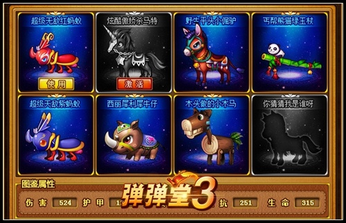 而在秋季“肆无忌惮”版本中,加入了全新的飞龙元素,弹迷们将在地穴和勇士秘境中见到越来越多的可爱龙兽,再然后,拥有一头龙的梦想就不远啦。4399弹弹堂3中独有的坐骑图鉴系统,可以让弹迷们随时查看最新的坐骑,更是加入了收集玩法,通过收集齐全部的坐骑碎片来将你喜爱的坐骑激活,赋予了坐骑们一种生命的张力~