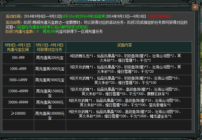 3)分阶段充值送装备(时间:第一阶段9.6-9.12 第二阶段9.13-9.18)