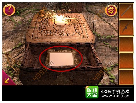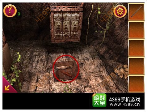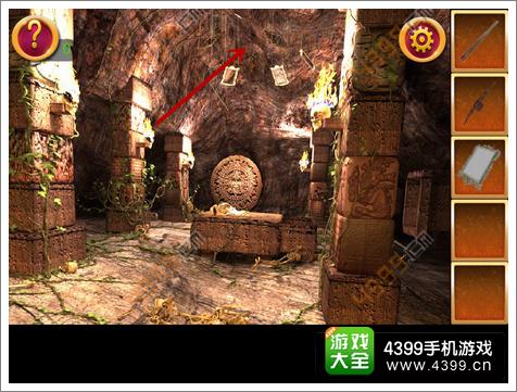 2.得到木棍后,点击图中箭头所指位置,可以看到三个人面石像,点击顺序为左右中,这时得到铁锹的头。