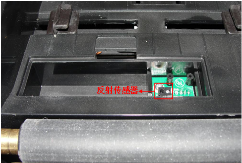 2、取下反射传感器护板,将反射传感器移动到珠宝标签左边的打印区域,如下图所示。然后安装好碳带并闭合碳带支撑架