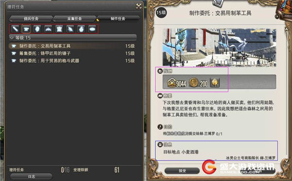 首先要向大家说明的是行会理符任务分佣兵、采集、制作三种,在主线任务做到10级之后开放此功能,各大地图均有任务发行人。采集和制作行会理符任务可以在生活职业后期获得大量经验。本期着重制作任务,大家可以利用这些任务快速升级制造业。