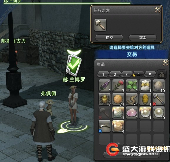 筹集任务:制作一样物品,交到异地的NPC。蓝框标出的是所交任务的NPC,有的NPC距离很近,在一个地图,有的需要跑图,玩家需要看清楚。