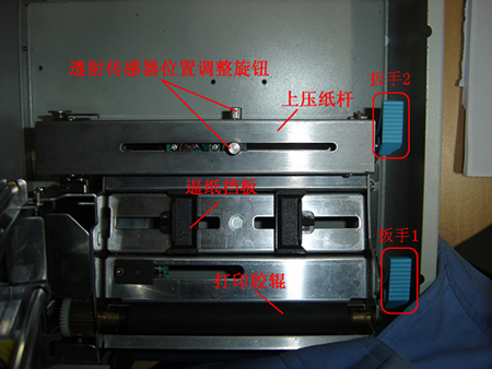 2)压下扳手2,抬起上压纸杆,可以看到透射传感器接收管,如下图所示: