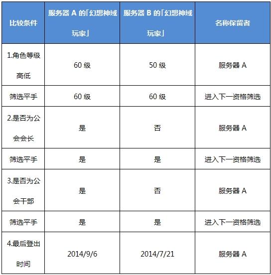 2、同名角色人物:服务器合并后,同名的角色将会由下列资格依序进行对比,先符合资格的角色则拥有这个名字的资格。资格不符的玩家在使用该角色登入时,系统会强制玩家需进行改名方可登入游戏,不改名者将无法登入游戏。