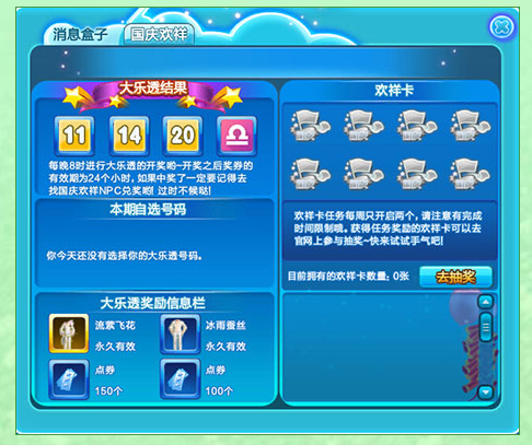 拼好运、拼人品,久违的大乐透再度上线,前往浪漫海滩找到国庆活动欢祥NPC后即可选择今天的幸运数字。每晚8点将为开奖时间,只要你运气足够好,你将获得永久非卖光效服饰等奖励。
