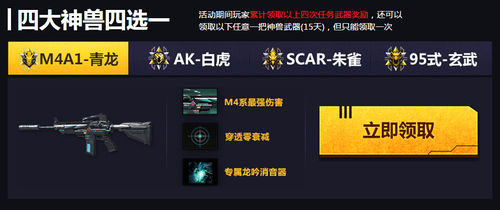 3如您当天没有成功抢得麒麟AR15的体验资格,但完成当天的游戏任务,您还可以免费领取一把战地系列武器,累计四次完成任务四大神兽任选其一,同时您还可获得第二天抢得麒麟AR15体验几率的提升5%,但几率不叠加;