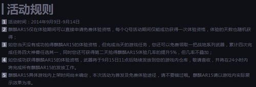 2麒麟AR15仅在体验期间可以直接申请免费体验资格,每个Q号活动期间仅能成功获得一次体验资格,体验的天数也随机获得;