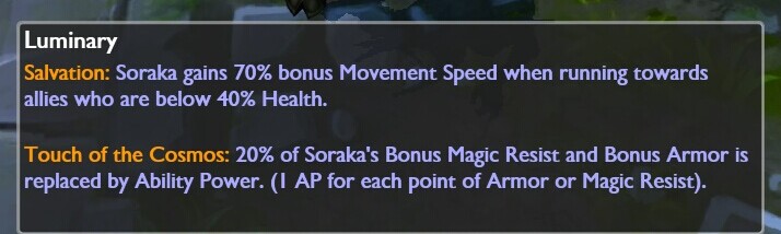 宇宙之触:索拉卡的护甲和魔抗的20%将转化为法术强度(1点护甲或魔抗转化为1点法强)