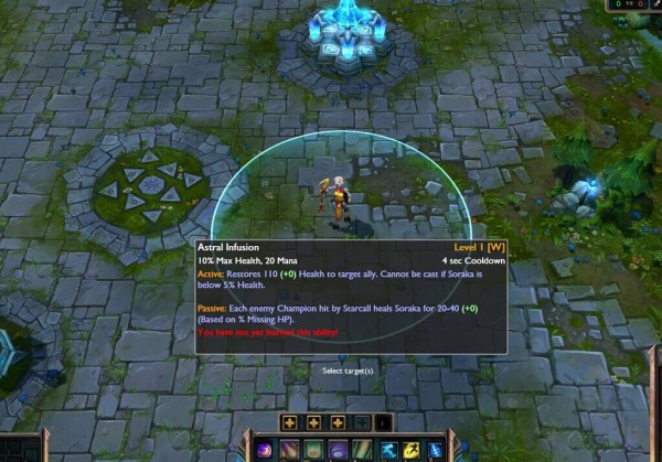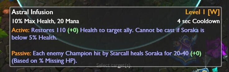 效果:恢复110/140/170/200/230(+0.6AP)目标盟友的生命值。如果索拉卡自己的生命值低于5%则无法施放。