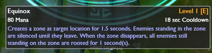 创建一个持续1.5秒的目标位置,站在区域内的敌人将会被沉默,直到他们离开。当区域消失后,仍然站在区域中的敌人将被禁锢1/1.25/1.5/1.75/2秒。