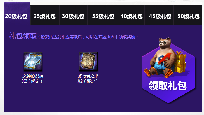 1.当玩家等级达到20、25、30、35、40、45、50级时,可通过页面领取对应的等级礼包。