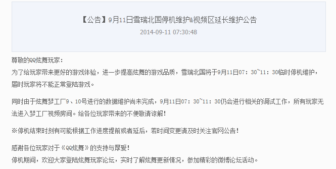 qq炫舞雪瑞北国在9月11日早上7点半开始更新维护,雪瑞北国维护到什么时候?下面就来看看qq炫舞官网9月11日雪瑞北国停机维护&视频区延长维护公告。
