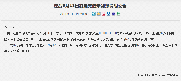 由于运营商的机房在今天(9月11日)凌晨出现故障, 故障波动时间约在0:00—3:00之间,会造成少部分玩家出现充值NZ点未到账的问题,我们已经定位了原因,正在进行数据库的核对,很对完成后,将会自动将玩家充值未到账的NZ点补发到游戏内的账户。