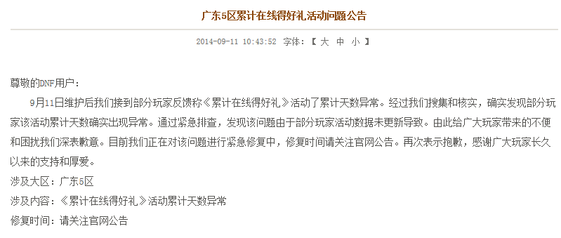 9月11日维护后我们接到部分玩家反馈称《累计在线得好礼》活动了累计天数异常。经过我们搜集和核实,确实发现部分玩家该活动累计天数确实出现异常。通过紧急排查,发现该问题由于部分玩家活动数据未更新导致。由此给广大玩家带来的不便和困扰我们深表歉意。目前我们正在对该问题进行紧急修复中,修复时间请关注官网公告。再次表示抱歉,感谢广大玩家长久以来的支持和厚爱。