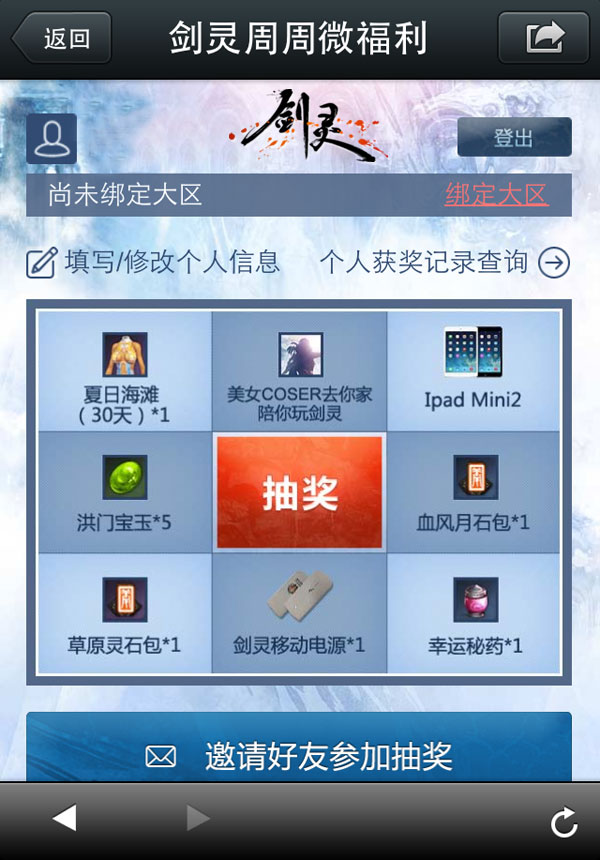 9月5日至9月21日期间,玩家想要参与《剑灵》每周微抽奖活动,每周至少需登录游戏三次才能获得一次珍贵的抽奖机会。活动中,每期抽奖机会仅限当期抽奖,抽奖机会无法累积,在每周周一12点更新每周福利奖励时同步清除未消耗的抽奖机会,因此玩家千万要记得使用抽奖机会。因上一期的大奖空开,为此上期大奖将延续到本期。除此之外,本期奖励中还加入了数码奖品Ipad Mini2,登录《剑灵》即有机会“约会”女神,将Ipad Mini2带回家!