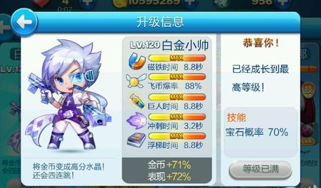 满级等级:120级,金币加成71%,表现分加成72%,磁铁时间8.8S,飞币爆率88%,巨人时间8.8S,冲刺时间3.2S,浮梯时间8.8S,技能触发概率70%