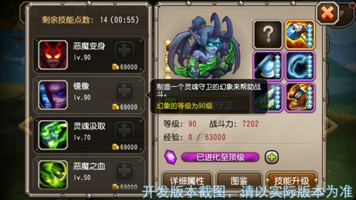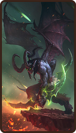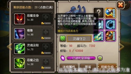 恶魔变身(大招):当灵魂守卫拥有一半以上能量时,他可以变身为一只强大的恶魔。恶魔形态持续消耗能量,具有远程攻击能力并且不受任何控制技能影响。