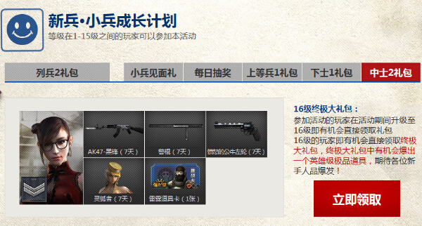 9月12日至10月10日,等级在1-15级之间的玩家来到活动页面,绑定大区后即可直接领取经验套装一份,在此基础之上等级高于列兵2级的玩家还可领取脱离笑脸礼包。战力十足的角色,火力强劲的武器,经验卡等道具让新兵玩家的战斗力直线提升。相信新兵礼包会让玩家们的成长之旅更加顺畅。
