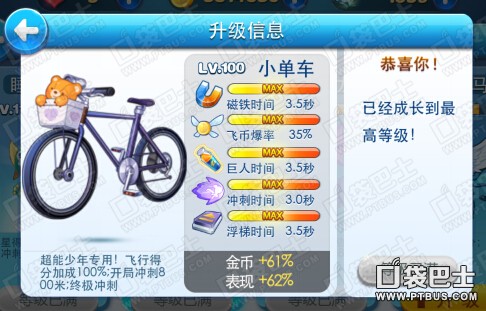 技能:开局冲刺800米,附加终极冲刺,飞行得分加成100%
