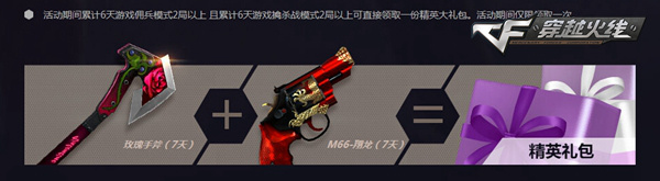 除了每日抽奖外,活动期间累计6天游戏佣兵模式2局以上,且累计6天游戏擒杀战模式2局以上的玩家还可直接领取一份精英大礼包。玫瑰手斧与M66-翔龙将直接赠予老兵,活动期间仅限领取一次。