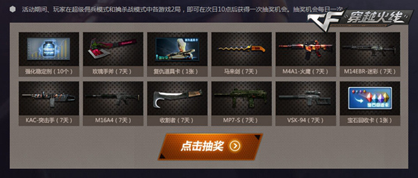 2014年8月28日至2014年9月15日,玩家在超级佣兵模式和擒杀战模式中各游戏2局,即可在次日10点后获得一次抽奖机会。强化稳定剂、玫瑰手斧、复仇道具卡、马来剑、M4A1-火鹰、M14EBR-迷彩、KAC-突击手、M16A4、收割者、MP7-S、VSK-94、宝石回收卡等道具百分百获得,抽奖机会每日一次,好礼不容错过。