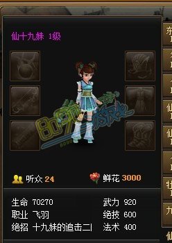 伙伴介绍:他的身世是一个谜,有人打趣的说她的名字是因为她是神仙道中第19个女性伙伴。但是我们所看到的是一个武功高强、嫉恶如仇、天真活泼的女侠风范的伙伴。她也并不是神话故事中位列仙班的仙佛神将,可能作者塑造这样一个伙伴只是为了代表正义的女侠客吧。游戏中的她是十分可爱的萝莉造型哦。