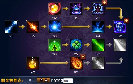 60级以后法师治疗和输出的分化愈发明显,建议开通双技能。一套技能应对副本和多人竞技,一套强输出技能应对挑战和战场。当然对于非RMB玩家,这里也会推荐一套比较中庸的加点方式,即可用作辅助也能用作输出。下面以68级法师为例对法师几种技能树加法分别进行阐述。