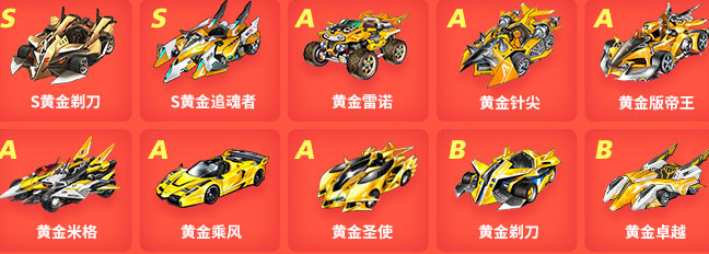 s黄金剃刀、s黄金追魂者、a黄金雷诺、a黄金针尖、a黄金版帝王、a黄金米格、a黄金乘风、a黄金圣使、b黄金剃刀、b黄金卓越其中的赛车之一。