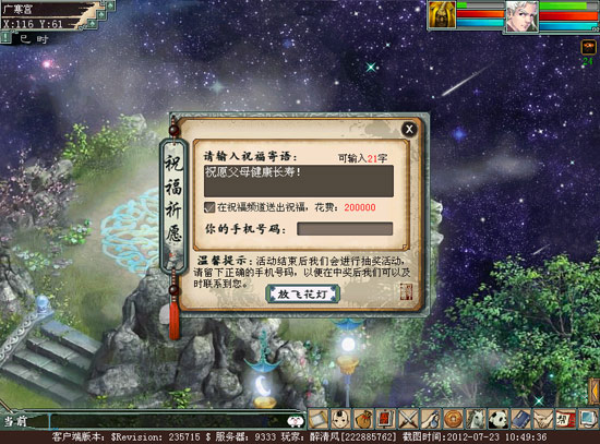 活动流程:活动期间到广寒宫(110,59)找梦仙子放花灯许愿。