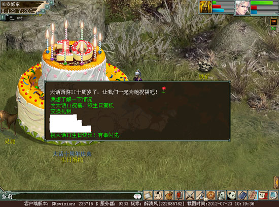 活动说明:活动期间,长安城东会放置一个大话II十周岁的巨型生日蛋糕。每天玩家都可以去点击生日蛋糕选择为大话II祝福和交换礼物。