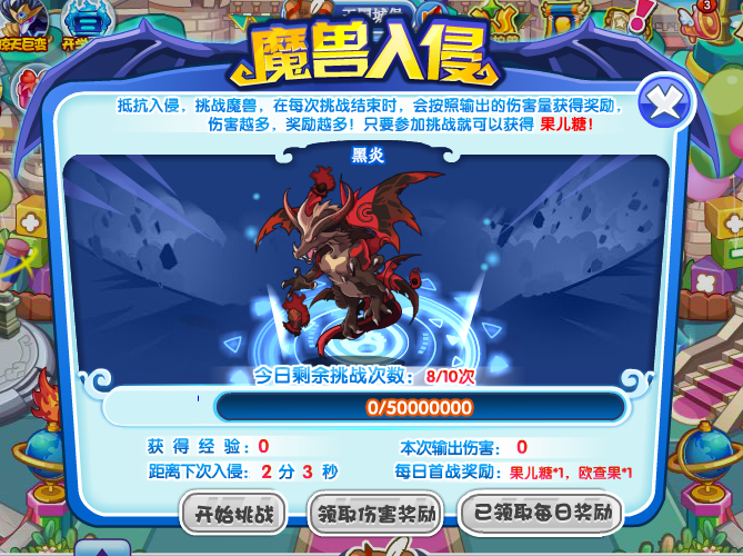 6、另外,每天参加魔兽入侵,还可以领取果儿糖和欧查果!