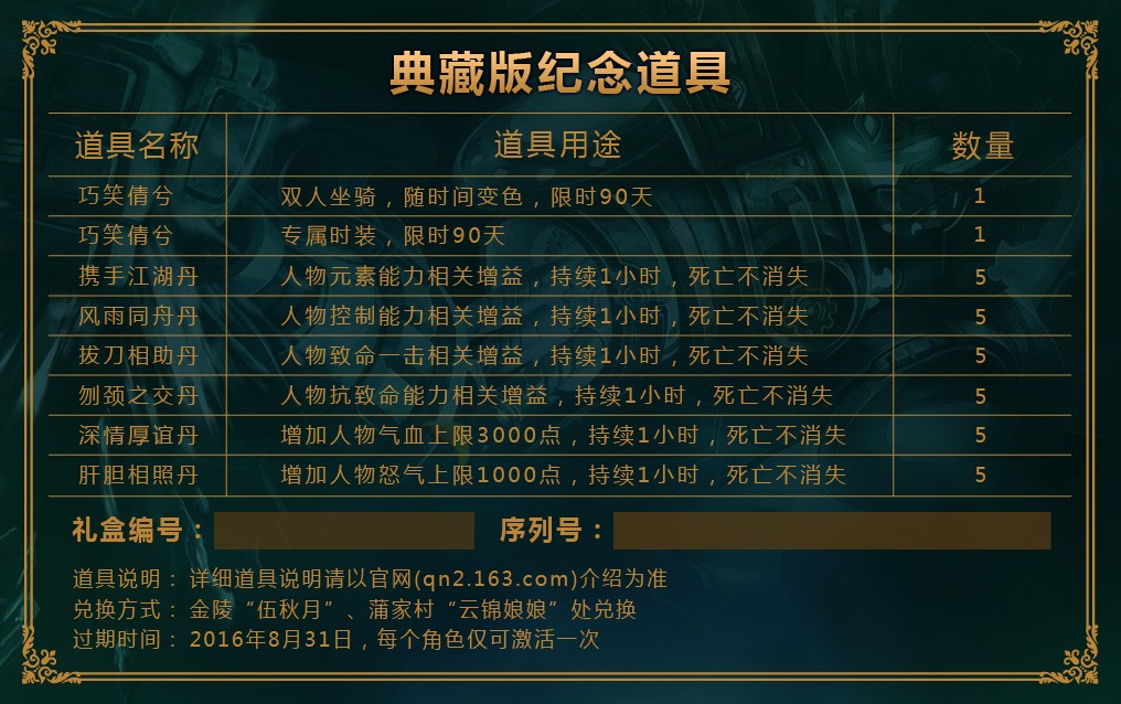 2.典藏版礼品卡与炫装版礼品卡互不冲突,但典藏版礼品卡一个角色仅可使用一次;