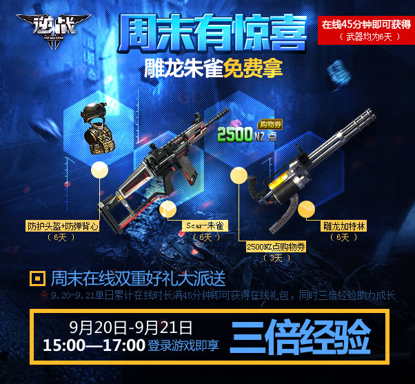 周二到了,周末还会远吗?尽管今天才9月16日星期二,但这似乎一点也不妨碍逆战推出9月20日-21日周末在线活动。据悉,逆战于今天贴出了主题为“周末有惊喜 朱雀雕龙免费拿”的主题活动,据活动介绍,在9月20日-21日周末在线45分钟即可获得在线礼包,朱雀雕龙6天奖励任你来拿,对了,还有三倍经验哦!下面就和小编一起来看看活动详情介绍吧!