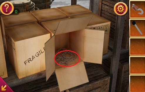 3、在场景左边的架子上也有几个木盒子,大家点击这几个木盒子,利用刚才获得的小刀将纸箱子划开,里面有一截铁链,获取铁链。