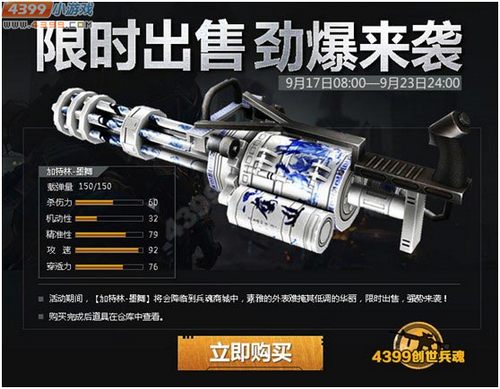 完成条件: 活动期间,【加特林-墨舞】将会降临到兵魂商城中,素雅的外表难掩其低调的华丽,限时出售,强势来袭!