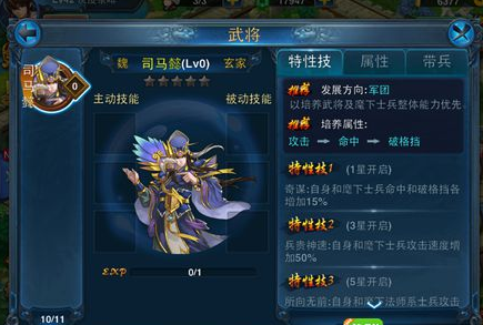 司马懿培养心得:司马是军团型武将,实际上他最厉害的特技是第二个,所以在使用司马懿时,先要将其兵贵神速特性技培养出来。需要注意的是第三个特技只有带法师(方士)的时候才会生效。根据测试,发现攻速的公式应该是攻击间隔/(1+攻速加成)。司马在战斗中如果能够激活蓝色的主动乱武,那他的攻速将会达到1秒1下(其他的远程是2秒1下)。所以如果你有主动乱武且在培养军团的话,可以考虑优先给他。