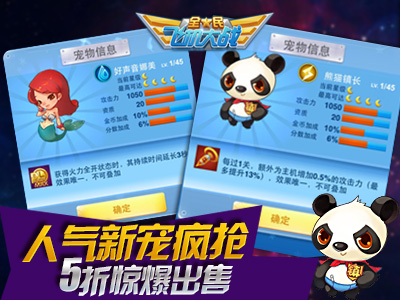 《全民飞机大战》为所有飞行员提供宠物购买补贴!9月16日至18日期间,拥有高达1050满级攻击力且可为主机提供攻击力加成的熊猫镇长,携手同样攻高且可延长火力全开状态的好声音娜美5折惊爆上架积分商城!9月16日至18日晚间21:00-22:00,游戏全面开启限时双倍金币加成,让你疯狂体验新宠魅力!活动仅限3天,错过不再有!