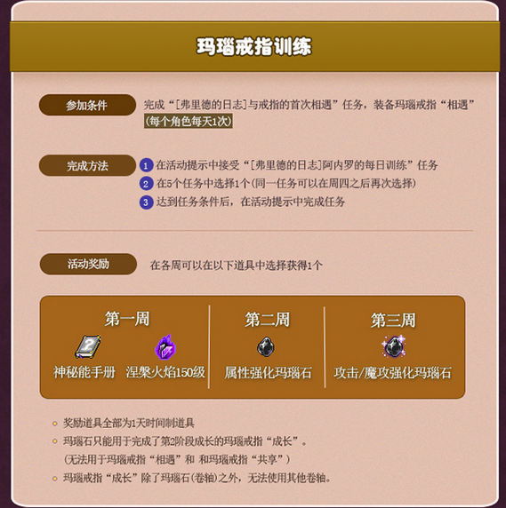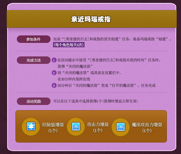 冒险岛揭开弗里德的日志,探寻只属于你的玛瑙戒指活动开始了,让我们一起揭开玛瑙戒指诞生的故事,并把玛瑙戒指成长成拥有属于自己的效果的强力戒指。