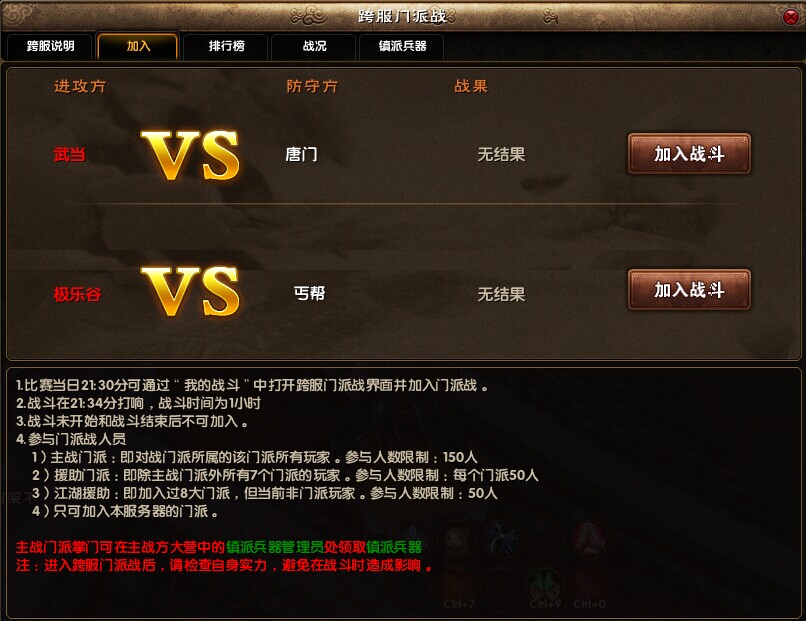 2. 加入门派战仅以服务器为单位,如当日对战门派为少林VS武当,攻方的武当弟子可以援助本服少林去攻打守方武当。