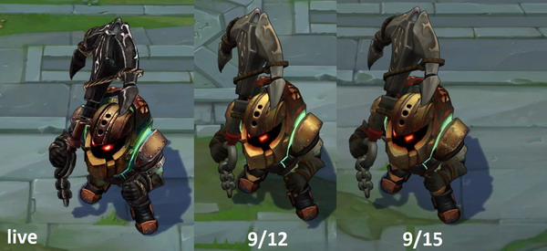 今日测试服调整的是库奇(飞机)和诺提勒斯(泰坦)。【从左到右依次为:正式服版本、9.12PBE版本、9.15PBE版本】