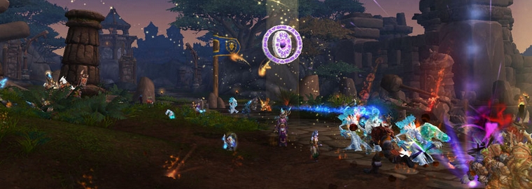 *玩家可以用远古遗迹碎片在这个区域内开启传送门。法师传送门可以让你立即传送回所属阵营基地,术士传送门可以在西北方的毁灭斗兽场和东南方的熔岩采石场互相传送