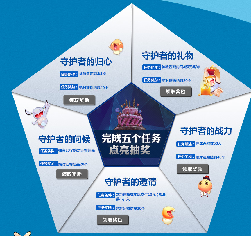 2、每完成一个任务,可领取相应奖励;每个任务只能领取一次奖励。